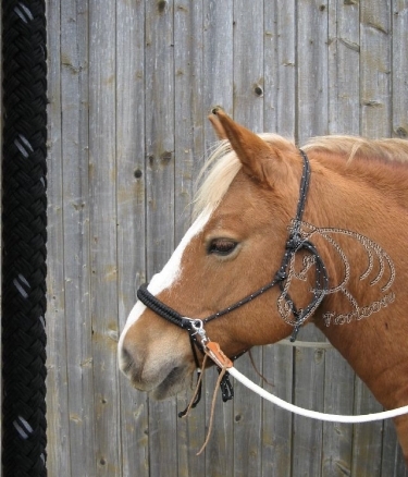 Povrazová jazdecká ohlávka vyrobená z čiernej šnúry pretkana reflexnou páskou a s čiernym opletom nosu.